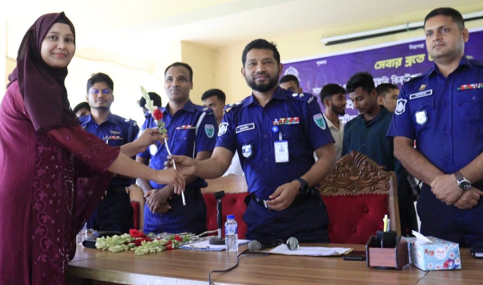 বাংলাদেশ পুলিশের ট্রেইনি রিক্রুট কনস্টেবল (টিআরসি) পদে মৌলভীবাজার জেলার ১৯ জন প্রার্থী প্রাথমিকভাবে নির্বাচিত হয়েছেন । আজ (২৯ মে) দুপুরে মৌলভীবাজার পুলিশ লাইন্স ড্রিল শেডে প্রাথমিকভাবে নির্বাচিত ১৯ জনের নাম ঘোষণা করেন নিয়োগ বোর্ডের সভাপতি এবং মৌলভীবাজার জেলার পুলিশ সুপার জনাব এম, কে, এইচ, জাহাঙ্গীর হোসেন, পিপিএম- সেবা।নির্বাচিত ১৯ জনের মধ্যে উপজাতি কোটায় ১ জন এবং সাধারণ কোটায় ১৮ জন। এদের মধ্যে নারী ৩ জন এবং পুরুষ ১৬ জন। নিয়োগ বোর্ডের সভাপতি ও পুলিশ সুপার জনাব এম, কে, এইচ, জাহাঙ্গীর হোসেন বলেন, 'সর্বোচ্চ পেশাদারিত্বের সাথে আমরা এই নিয়োগ প্রক্রিয়া সম্পন্ন করেছি। এখানে নির্বাচিত সবাই নিজেদের মেধা ও যোগ্যতায় ১৯ জনের মধ্যে অন্তর্ভুক্ত হয়েছে। আমরা প্রত্যাশা করি সবাই তোমাদের কর্মক্ষেত্রে সততার সঙ্গে কাজ করবে।' এসময় প্রাথমিকভাবে নির্বাচিতদের জেলা পুলিশের পক্ষ থেকে মিষ্টি মুখ করানো হয় এবং ফুল দিয়ে শুভেচ্ছা জানানো হয়। তিন ধাপে শারীরিক সক্ষমতা যাচাই-বাছাই শেষে ২৮১ জন প্রার্থী গত ২০ মে ২০২৫ তারিখ লিখিত পরীক্ষায় অংশগ্রহণ করেন। লিখিত পরীক্ষায় উত্তীর্ণ প্রার্থীরা আজ (২৯ মে) মনস্তাত্ত্বিক ও মৌখিক পরীক্ষায় অংশগ্রহণ করে। ফলাফল ঘোষণার সময় আরও উপস্থিত ছিলেন অতিরিক্ত পুলিশ সুপার (হবিগঞ্জ) জনাব মোহাম্মদ আতিকুল হক, অতিরিক্ত পুলিশ সুপার (সিলেট) জনাব মোঃ রফিকুল ইসলাম, অতিরিক্ত পুলিশ সুপার (প্রশাসন ও অর্থ) জনাব আসিফ মহিউদ্দীন, পিপিএমসহ নিয়োগ কার্যক্রমে নিযুক্ত অন্যান্য পুলিশ কর্মকর্তা-কর্মচারীবৃন্দ।